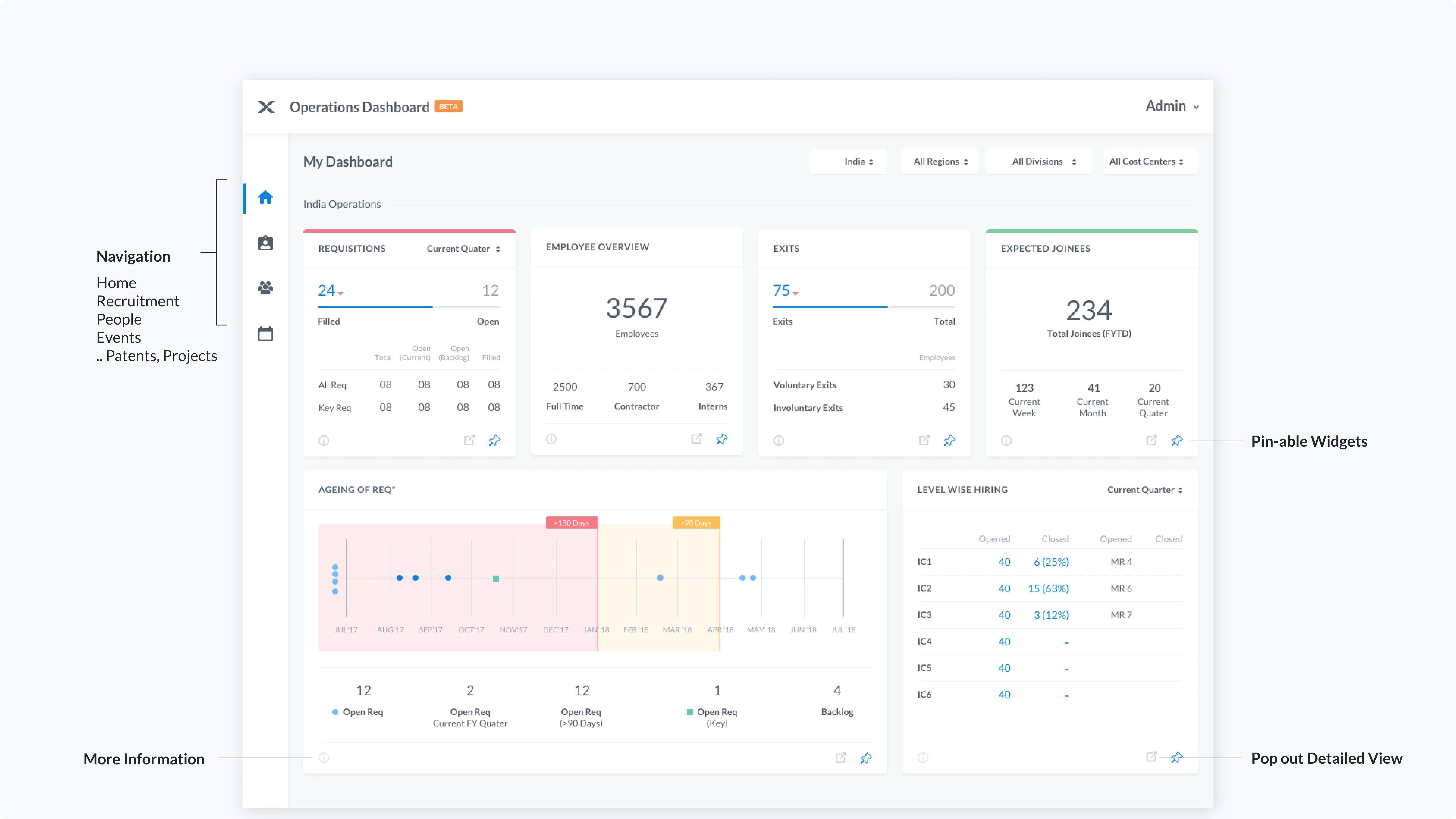 India Operations dashboard intends to support in depth briefing to stakeholders ranging from executives to managers. Its is a web interface and can be extended to mobile. It support varied operations and analysis on Key Performance Indicators such as recruitment, innovation, human resource, events and college relations.