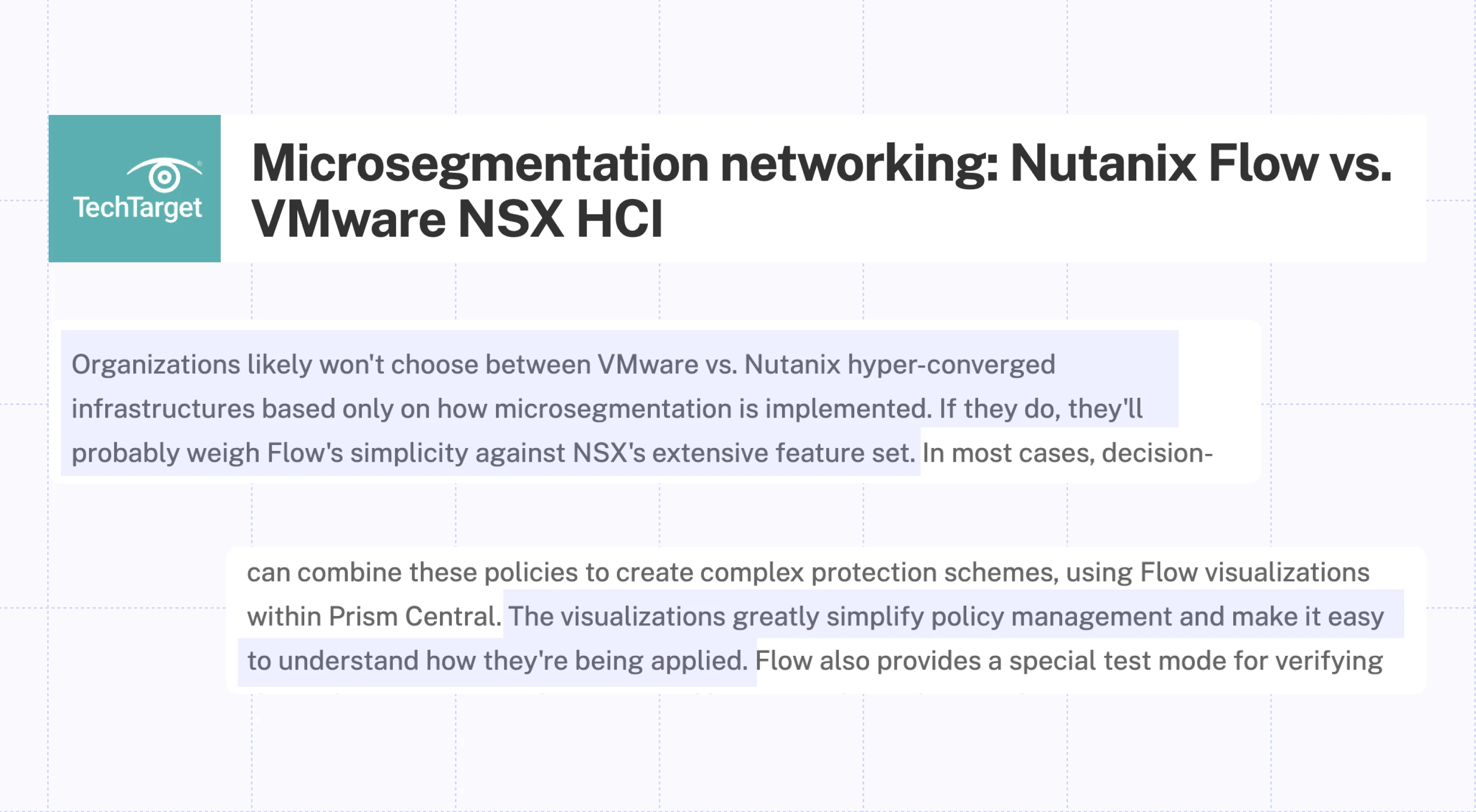"The visualizations greatly simplify policy management and make it easy to understand how they're being applied. Organizations likely won't choose between VMware vs. Nutanix hyper-converged infrastructures based only on how microsegmentation is implemented. If they do, they'll probably weigh Flow's simplicity against NSX's extensive feature set."